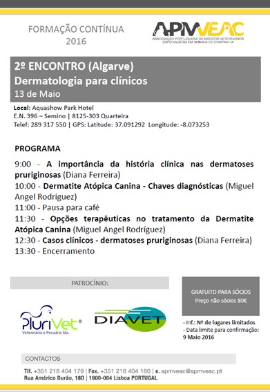 2º Encontro Dermatologia para clínicos – AlgarveNo próximo dia 13 Maio (6ª feira) a Plurivet e a Diavet em colaboração com a APMVEAC ao abrigo do programa Formação Contínua 2016 irão promover o “2º Encontro Dermatologia para clínicos” no Algarve.